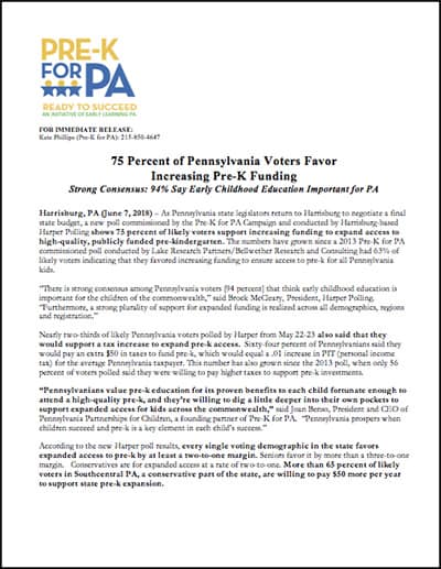 According to a new poll commissioned by the Pre-K for PA Campaign and conducted by Harrisburg-based Harper Polling, there is strong consensus among Pennsylvania voters [94 percent] that think early childhood education is important for the children of the commonwealth. Furthermore, a strong plurality of support for expanded funding is realized across all demographics, regions and registration. Please visit the documents below for the full results of the poll.